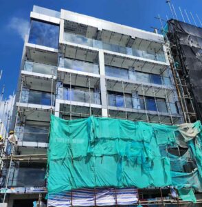 – A newly completed multi-storey residential building with glass façades and construction netting still partially in place.